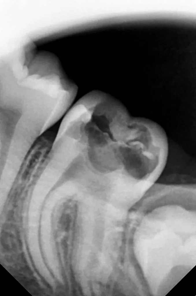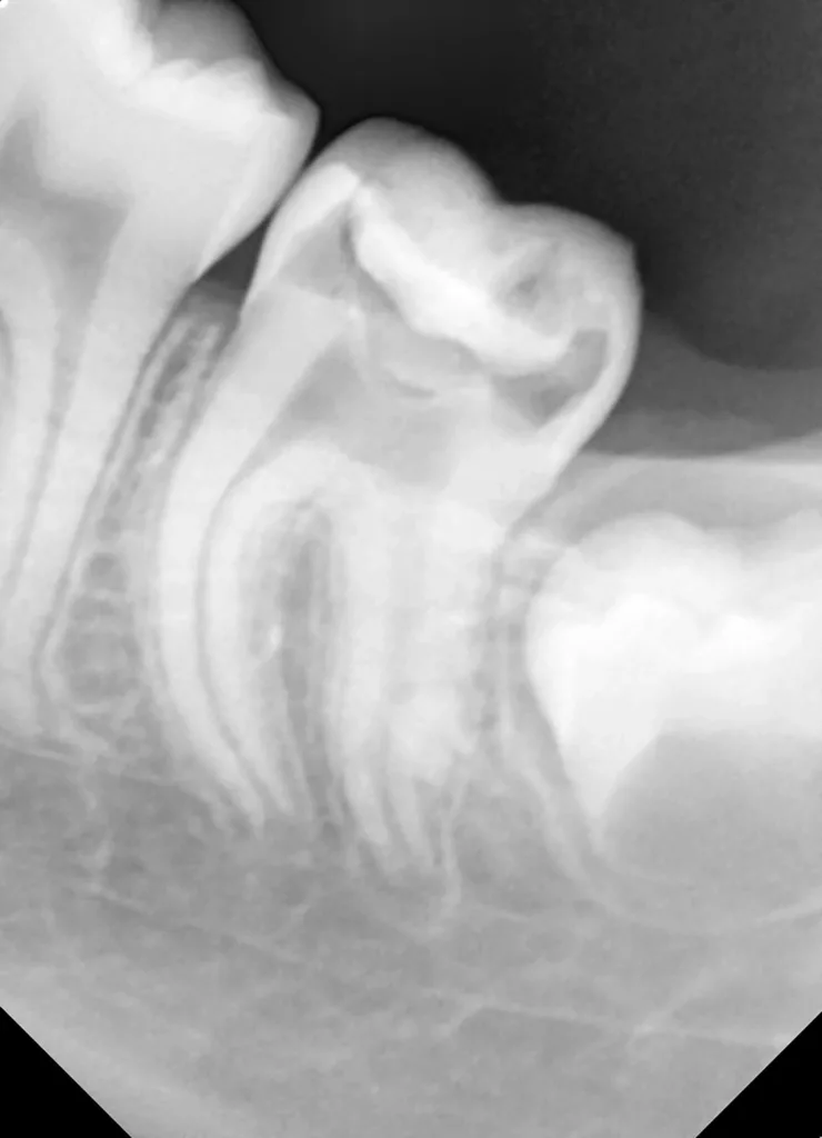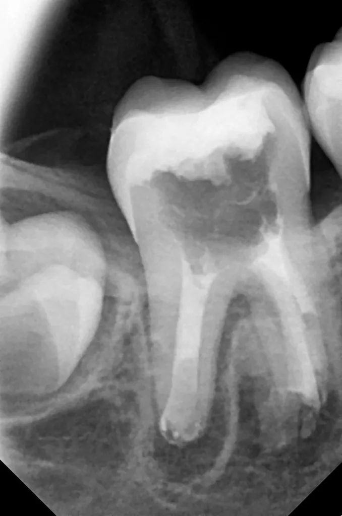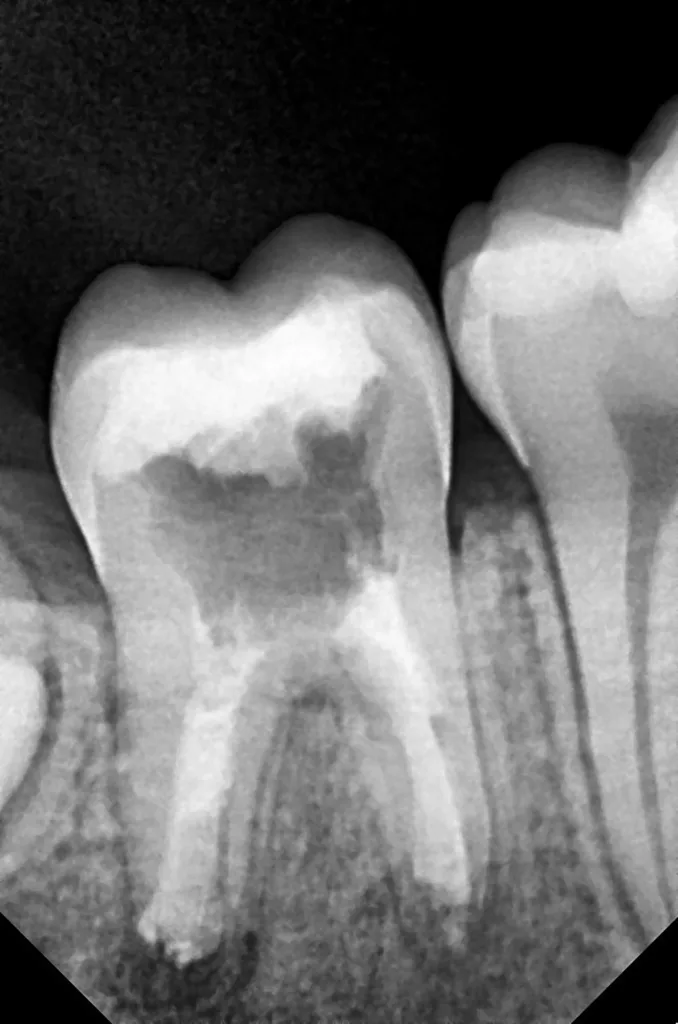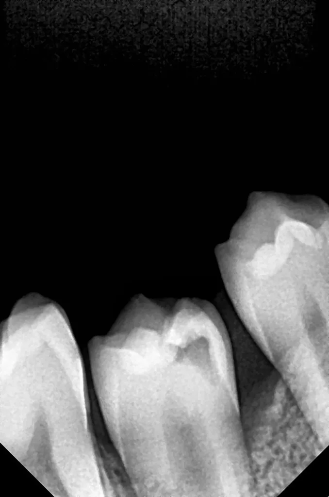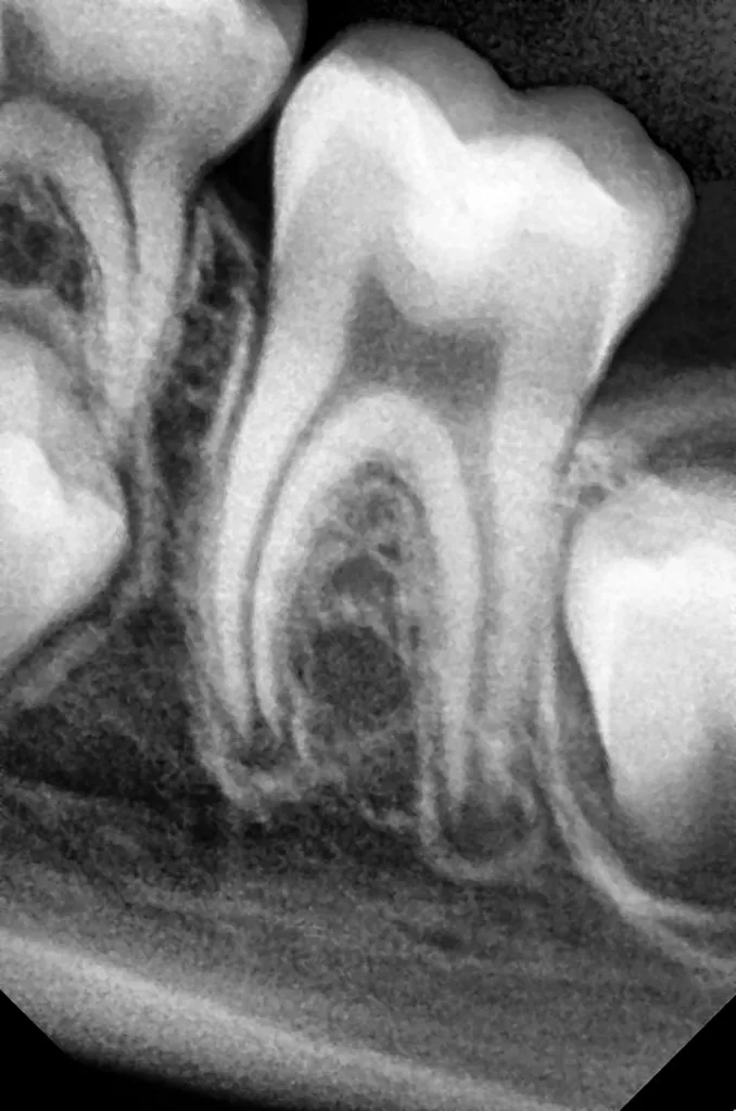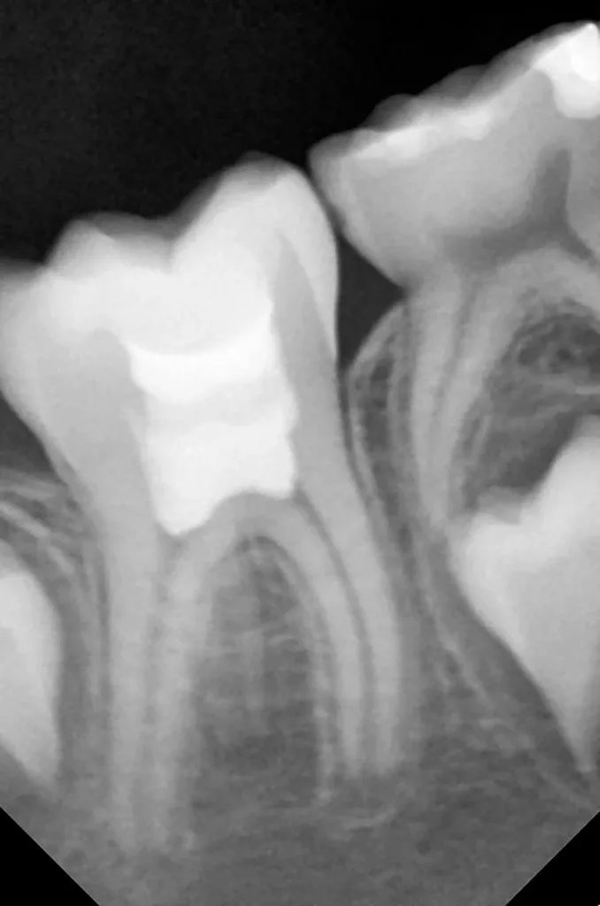 Das 13-jährige Mädchen wurde von unserer Kollegin mit der Bitte um die Behandlung des in der Durchbruchsphase befindlichen, symptomfreien Zahnes 37 an uns überwiesen. Es zeigte sich eine umfangreiche Resorption von Zahnschmelz und Dentin fast bis zum Pulpakavum (Grad 3 der Läsion nach Seow), die voll mit Weichgewebe gefüllt war (Abb. 29 und 30). Auf einer Panoramaschichtaufnahme, die vor zwei Jahren während der kieferorthopädischen Anfangsuntersuchung angefertigt wurde, wies der Zahn 37 keinerlei Anzeichen von PEIR auf (Abb. 31). Die Progredienz und der Umfang der Resorption in diesem Fall zeigen uns, wie aggressiv eine PEIR sein kann. Für die zuweisende Kollegin war es sehr schwierig, das resorbierende Weichgewebe zu entfernen, eine Diagnostik des Zustandes der Pulpa vorzunehmen und die Krone zu restaurieren. Deswegen kam die junge Patientin mit einer temporären Füllung aus Glasionomerzement zu uns (Abb. 32 und 33). Trotz der klinischen Symptomlosigkeit und fehlender radiologischer Befunde, die auf periapikale Veränderungen hinweisen, konnte aus der Ausdehnung der PEIR geschlussfolgert werden, dass die Pulpa bereits betroffen sein dürfte. Eine deutlich erschwerte Zugänglichkeit zum Zahn und die ausgeprägte Kurvatur der noch wachsenden Wurzeln ließen die übliche Wurzelkanalbehandlung problematisch erscheinen. Die verschiedenen Behandlungsmöglichkeiten von Vitalerhaltung der Zahnpulpa bis zur Extraktion wurden mit den Eltern des jungen Mädchens besprochen. Eine Extraktion des Zahnes hätte die Einordnung des Weisheitszahnes (entsprechend der kieferorthopädischen Konsultation) problemlos ermöglicht und somit auch die Kaufunktion vollumfänglich ohne eine verkürzte Zahnreihe sichergestellt. Trotzdem wollten die Eltern den Zahn 37 so lange wie möglich erhalten, auch um eine eventuelle Sedierung des Kindes während der Extraktion zu vermeiden.