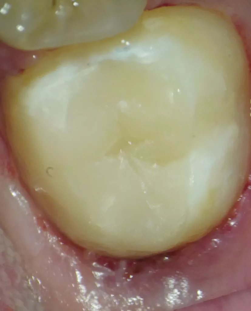 Im Rahmen der jährlichen Kontrolluntersuchung wurde bei einem achtjährigen Mädchen auf der routinemäßig angefertigten Röntgenaufnahme eine mittelgroße PEIR des Zahnes 46 (Grad 2 der Läsion nach Seow) entdeckt (Abb. 43). Die Patientin war komplett beschwerdefrei und der Zahnschmelz des betroffenen Zahnes sah intakt aus (Abb. 44 und 45). Weil auch hier der PEIR-Defekt gräulich durchschimmerte (Abb. 44 und 45) und der Zahn bereits seit einem Jahr durchgebrochen war, entschieden wir uns in diesem Fall, den Defekt klassisch mit Komposit zu restaurieren. Unter Lokalanästhesie mit Septanest 1/100 000 (Septodont, Frankreich) wurde zunächst Kofferdam mithilfe der Klammer U67 (KSK Dentech, Japan) gelegt (Abb. 45). Weder visuell noch mittels Sondierung konnte eine Verbindung zur Läsion festgestellt werden. Deswegen wurde an der Stelle, an welcher der PEIR-Defekt gräulich schimmerte, intakter Zahnschmelz der lingualen Querfissur entfernt (Abb. 46). Innerhalb der Läsion wurde nekrotisches intrakoronales Weichgewebe vorgefunden (Abb. 47), das problemlos mittels RONDOflex plus 360 (KaVo Dental, Deutschland) mit dem 27-µm-Pulver vollständig entfernt werden konnte. Der Boden des Defektes zeigte eine glatte, runde Form sowie helles, hartes und intaktes Dentin. Eine Präparation war nicht erforderlich, es wurde lediglich die Zahnschmelzkante geglättet (Abb. 48). Für die Restauration kamen erneut das Adhäsiv Optibond FL (Kerr, USA) und das Komposit Estelite ASTERIA OCE, A2B und Universal Flow AO2 (Tokuyama, Japan) zur Anwendung (Abb. 49). 6 Monate nach der Behandlung zeigte sich das Ergebnis sowohl aus klinischer als auch radiologischer Sicht stabil wie die Abbildungen 50 und 51 zeigen.