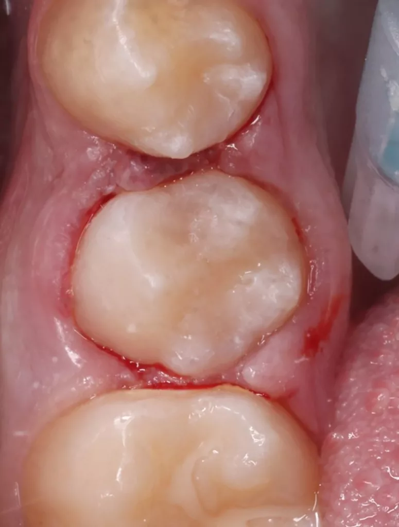 Der PEIR-Defekt schimmerte unter der lingualen Querfissur deutlich dunkler durch (Abb. 21), sodass die Entscheidung getroffen wurde, den Defekt an genau dieser Stelle zu eröffnen (Abb. 22). Das resorbierte intrakoronale Weichgewebe, das die Läsion nur zum Teil füllte, konnte dann gut visualisiert werden (Abb. 22). Kariös verändertes Dentin wurde nicht gefunden. Nach Eröffnung des Pulpahorns sah die Pulpa blass und avaskulär mit Anzeichen einer geringen Blutung aus (Abb. 23). Die komplette Kronenpulpa wurde bis zur Höhe der Kanaleingänge mit einem runden Diamantbohrer unter Wasserkühlung entfernt. Vor und nach der Prozedur wurde die Läsion zuerst mit 1%igem NaOCl und anschließend mit physiologischer Kochsalzlösung gespült. Die Blutung stoppte innerhalb von zwei Minuten vollständig, die Wurzelpulpa erschien gesund, regulär vaskularisiert und sauber (Abb. 24). Es wurde eine reversible Pulpitis diagnostiziert. Die Abdeckung der Wurzelpulpa erfolgte mit einem hydraulischen Kalziumsilikatzement (Rootdent, Technodent), der mit dem Glasionomerzement Fuji II LC (GC, Japan) als temporäre Füllung abgedeckt wurde. Die Platzierung des MTA-Zements wurde abschließend mittels einer Röntgenaufnahme überprüft (Abb. 27). Nach zwei Wochen war die junge Patientin komplett beschwerdefrei. Unter erneuter Trockenlegung mit Kofferdam wurde die adhäsive koronale Restauration mit Komposit Estelite ASTERIA OCE, A2B und Universal Flow AO2 (Tokuyama, Japan) mithilfe eines vorab angefertigten Okklusalstempels erstellt (Abb. 25 und 26). Ein Jahr später kam die Patientin beschwerdefrei zur Nachkontrolle. Das Röntgenbild (Abb. 28) zeigte keinen pathologischen Befund sowie eine physiologische Weiterentwicklung des Wurzelwachstums in Länge und Dicke der Wurzelwände.