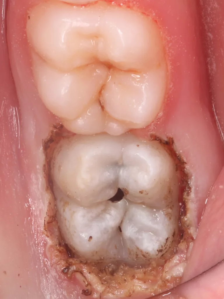 Nach einer chirurgischen Freilegung wurden die PEIR-Defekte in den meisten Fällen temporär mit Glasionomerzement oder IRM restauriert, wenn eine absolute Trockenlegung mit Kofferdamm nicht möglich war, um dann später (nach dem Durchbruch des Zahnes) eine suffiziente Kompositrestauration legen zu können [22,23,29,30]. Für PEIR-Läsionen, bei denen ein hohes Risiko einer Pulpaexposition gegeben ist, wird empfohlen, Handexkavatoren anstatt Rosenbohrer für die Entfernung des Weichgewebes zu nutzen [31]. In den von uns behandelten Fällen 3 und 5, die sehr komplexe Läsionen darstellten, konnte das residuale Weichgewebe weder mit Bohrern noch mit Handexkavatoren vollständig erreicht werden. Aus diesem Grunde kam hier zusätzlich eine Spülung mit 5,25%igem NaOCl zur Anwendung. So konnte das in Unterschnitten schwer erreichbare Weichgewebe aufgelöst werden. Bei den vor dem Durchbruch entdeckten PEIR-Fällen ist die Pulpa in der Regel nicht betroffen. Für die Vitalerhaltung dieser Zähne finden sich in der Literatur Empfehlungen zur Vitalerhaltung der Pulpa in Form einer indirekten oder direkten Überkappung – entweder klassisch mit Kalziumhydroxidpräparaten oder mit hydraulischen Silikatzementen wie MTA oder Biodentin [8,13,23,29]. Für umfangreiche Grad-III-PEIR-Läsionen bei Molaren, die oft nicht restaurierbar sind, ist im Allgemeinen die Extraktion die Methode der Wahl [25,32–34]. Der ideale Zeitpunkt für die Extraktion sollte kurz vor oder gleich nach dem Durchbruch des Zahnes sein, um den chirurgischen Eingriff weniger komplex zu halten [24]. In diesen Fällen ist eine spätere Einordnung der distalen noch nicht durchgebrochenen Molaren möglich, sodass die Kaufunktion – ohne eine verkürzte Zahnreihe – erhalten werden kann [25].