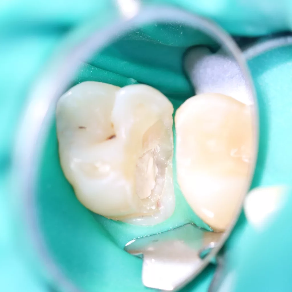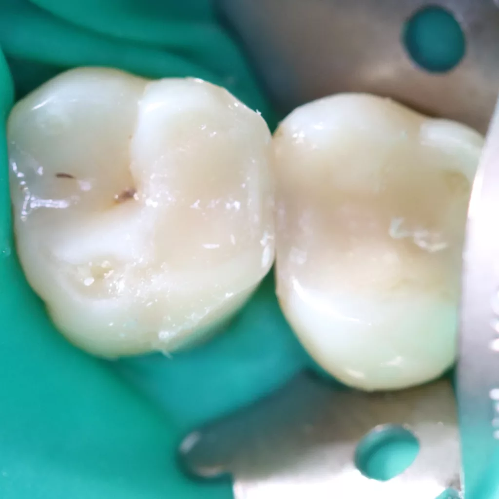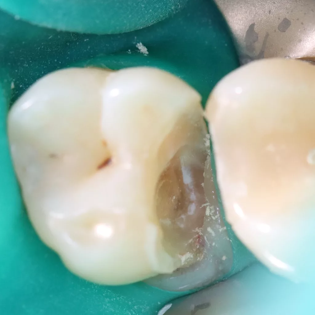 Wird eine profunde kariöse Läsion behandelt, empfiehlt sich folgendes Vorgehen [5]: Zunächst sollte in einem ersten Schritt ein Kofferdam appliziert werden, um eine möglichst keimfreie Arbeitsweise zu gewährleisten. Nach Präparation einer Zugangskavität, wenn dies notwendig ist, erfolgt die Kariesexkavation mittels Rosenbohrern oder Handexkavatoren. Wird in pulpanahen Arealen eine Eröffnung der Pulpa erwartet, sollte das Instrument gewechselt und ein sauberer Rosenbohrer genutzt werden. Tritt nach vollständiger Kariesexkavation keine Eröffnung der Pulpa ein, ist aber von einer dünnen Restdentindicke von etwa 300 µm auszugehen, oftmals erkenntlich durch eine zartrosa hindurchschimmernde Pulpa, sollte nach Kavitätentoilette mittels Natriumhypochlorit (NaOCl) 3% eine indirekte Überkappung mit einem hydraulischen Kalziumsilikatzement erfolgen [5]. NaOCl dient dazu, Bakterien und Toxine zu neutralisieren und das Dentin zu desinfizieren. Die Unterfüllung aus Kalziumsilikatzement soll auch desinfizierend wirken, das Pulpagewebe zur Heilung anregen und vor möglicherweise durch das Dentin penetrierenden Monomeren aus dem Dentinadhäsivsystem schützen [5], da diese die regelrechte Funktion der Odontoblasten beeinträchtigen können [9,40]. Im Anschluss muss eine direkte, dentinadhäsive Restauration zur Versorgung der Kavität platziert werden [5]. Die Abbildungen 1 bis 14 illustrieren das Vorgehen bei der Behandlung einer profunden kariösen Läsion mit indirekter Überkappung der Pulpa.