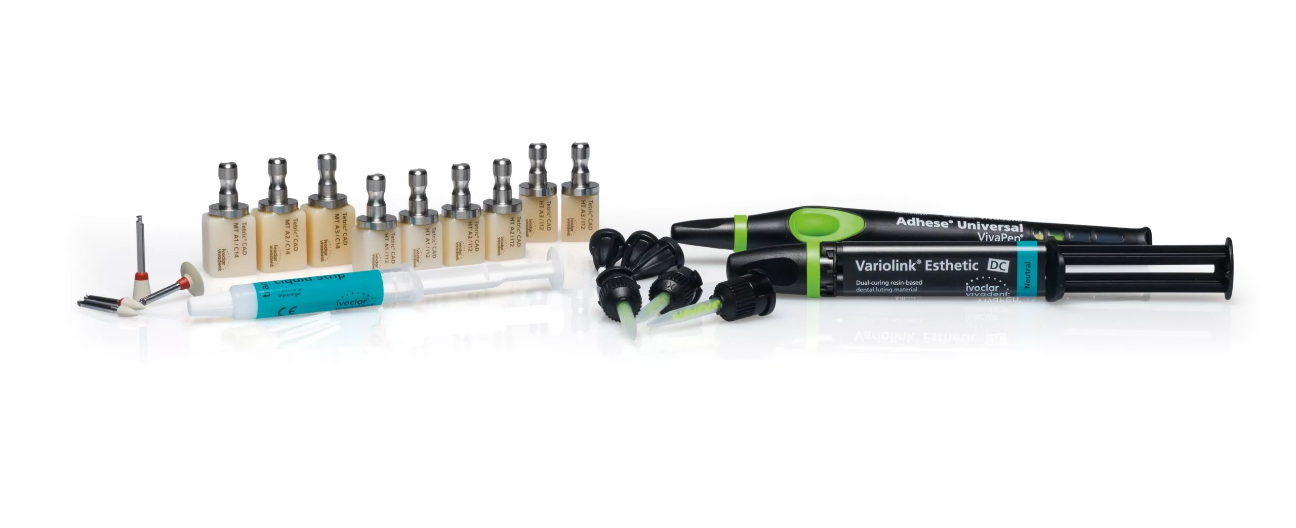 Hochleistungs-Composite werden lege artis nach dem bewährten adhäsiven Befestungsprotokoll auf Schmelz und Dentin verklebt. Zur Konditionierung der Composite-Oberfläche wird diese zuvor mit 50 mµ AlO2 angestrahlt. Nach dem Konditionieren mit Adhese® Universal werden sie z. B. mit Variolink® Esthetic adhäsiv eingegliedert.