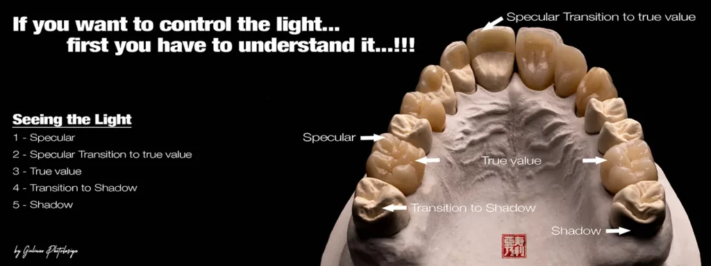 In der Fotografie ist Licht ein zentrales Element – ohne Licht gibt es keine Fotografie. Dabei nutzen die verschiedenen Beleuchtungstechniken entweder hartes oder weiches Licht. Hartes Licht dringt tief in den Zahn ein, reflektiert wenig und eignet sich besonders gut, um Dentin- und Farbstrukturen sichtbar zu machen.