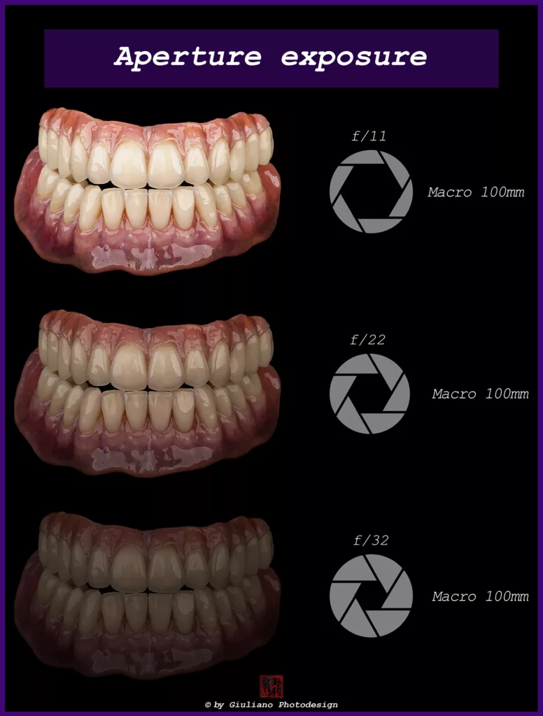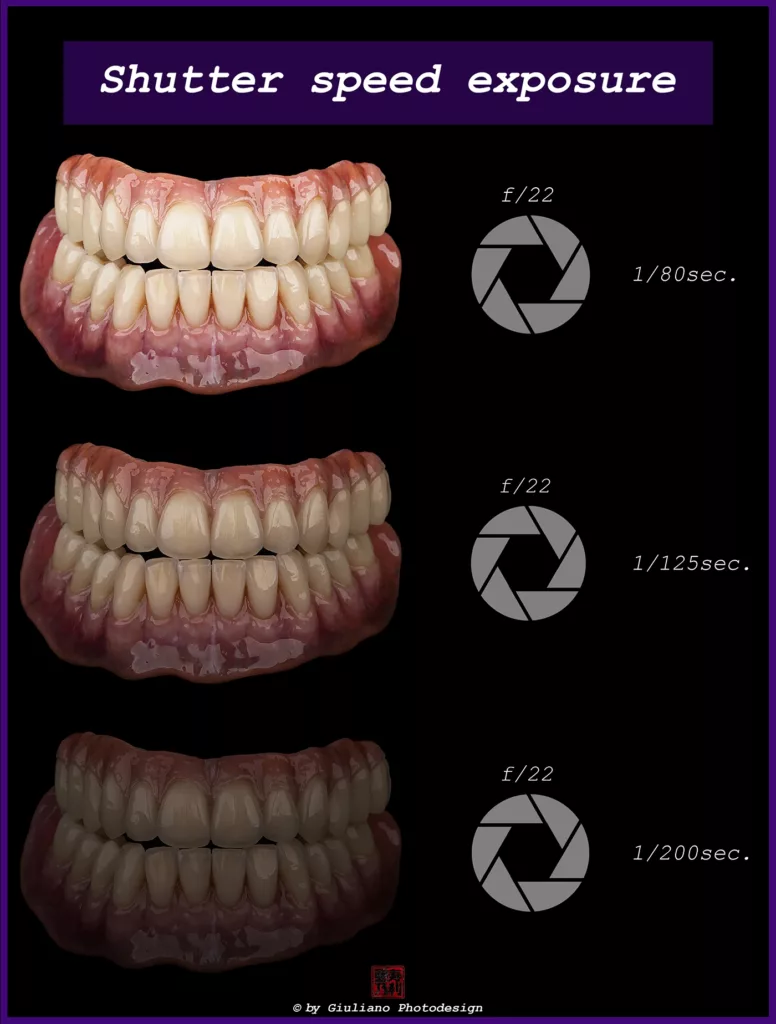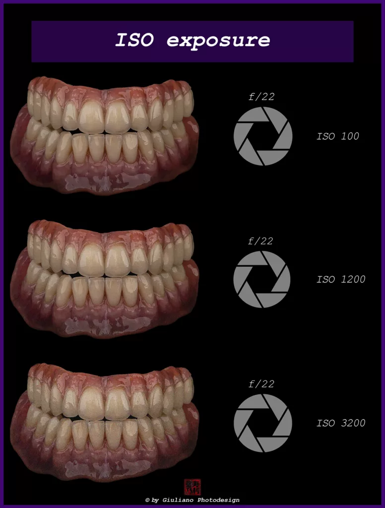 ISO verstärkt das Licht, das die Kamera aufnimmt. Eine höhere ISO macht das Bild heller, kann aber Rauschen verursachen und die Bildqualität beeinträchtigen. Daher muss der ISO-Wert sorgfältig im Belichtungsdreieck ausbalanciert werden (Abb. 10). An dieser Stelle sei erwähnt, dass es für die Intraoralfotografie und Produktfotografie spezifische Kameraeinstellungen gibt (Abb. 11).