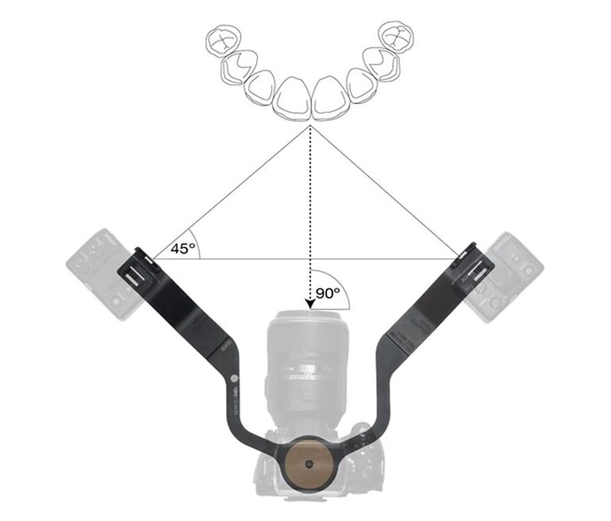 Fotospiegel sind ebenfalls unverzichtbar, um die okklusalen, inzisalen, bukkalen, lingualen und palatinalen Zahnoberflächen zu dokumentieren. Die Reflektivität der Spiegel variiert je nach Material: Titan reflektiert 80% des Lichts, rhodinierte Spiegel 75%, Chrom 65–70% und Edelstahl 50–60%. Ein weiterer Punkt sind fotografische Kontrastmittel, dies sind schwarz beschichtete Metallwerkzeuge, die in verschiedenen Formen erhältlich sind. Sie schaffen einen schwarzen Hintergrund, der die Transparenz und Details an den Zahnrändern betont. Beim Blitzzubehör spielen Blitzhalterungen eine entscheidende Rolle, wenn es darum geht, Winkel und Entfernung des Lichts flexibel anzupassen, besonders im Frontzahnbereich. Sie sind in verschiedenen Größen und Ausführungen erhältlich.