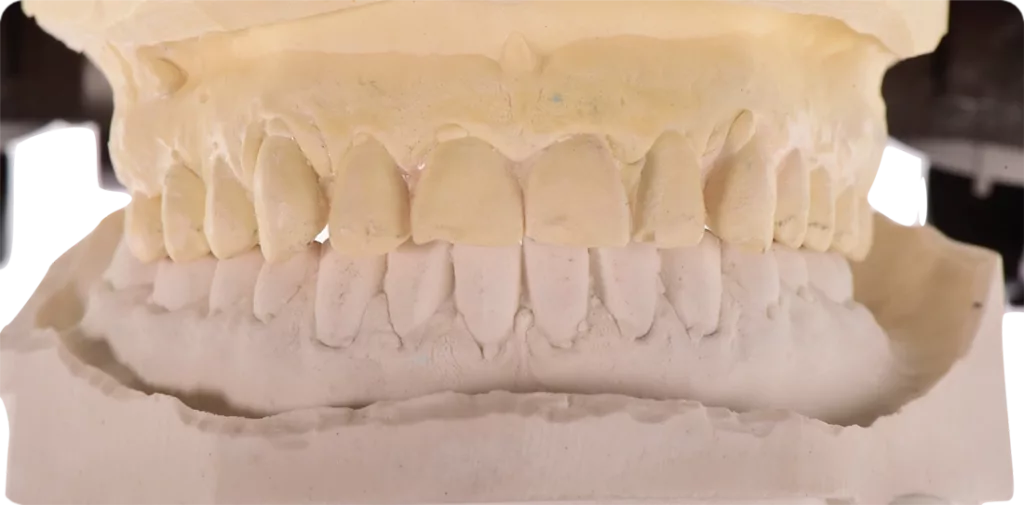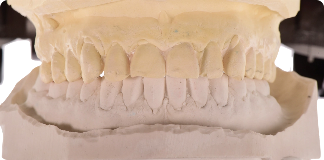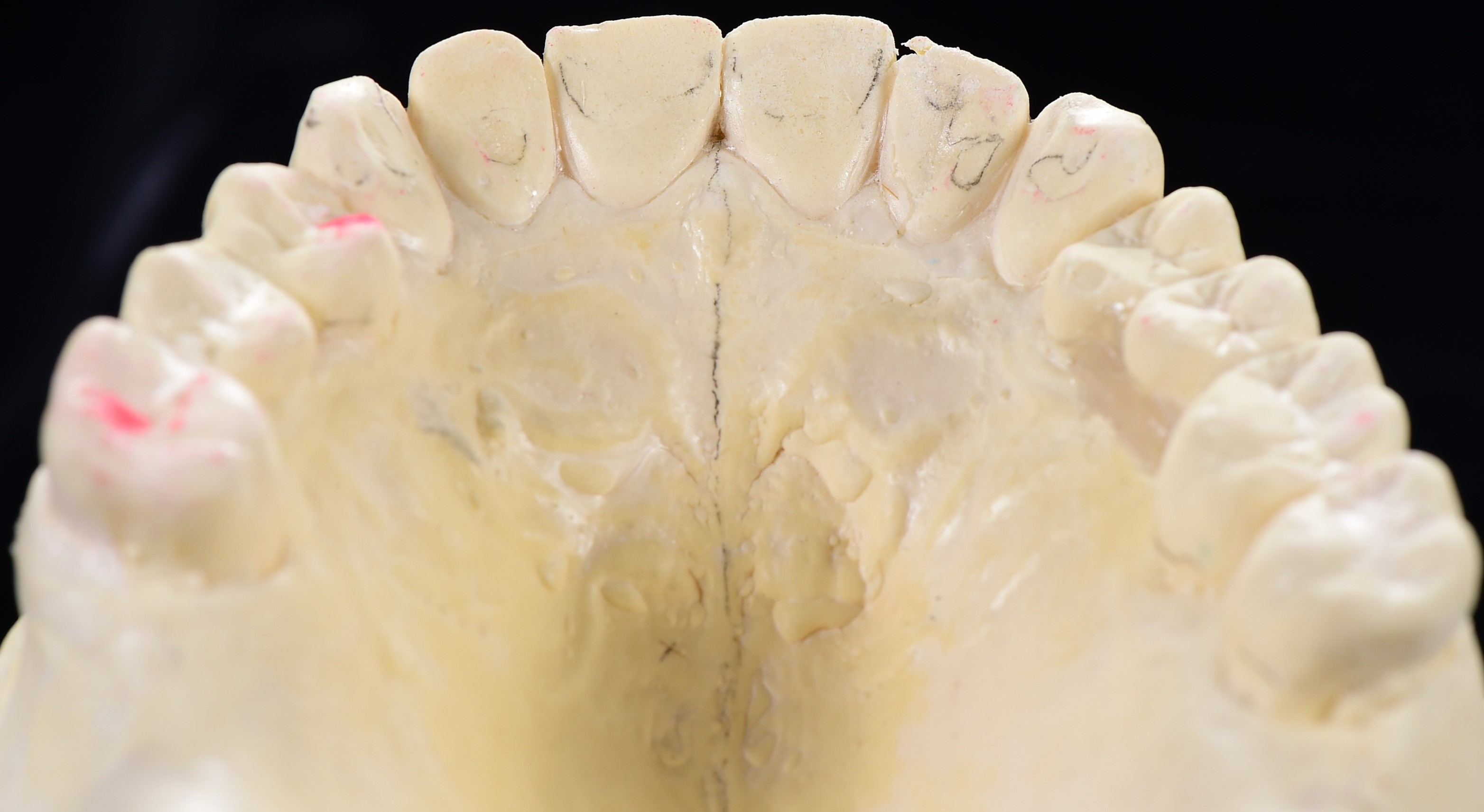 Jetzt kommt die Arbeit zum zweiten Mal ins Labor und mit den gewonnenen Daten lässt sich nun gezielt weiterarbeiten: Das Meistermodell wird erstellt und ein zweites Mal artikuliert. Über die Passung des Bissträgers, der auf den Innenteilen fixiert ist, lässt sich der Sitz der Innenteile auf dem Meistermodell noch einmal kontrollieren. Passt alles, kann die Herstellung der Sekundärkonstruktion beginnen. Das Mock-up liefert wichtige Informationen über Ästhetik und Dimensionen des geplanten Zahnersatzes.