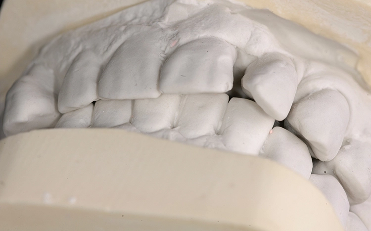Bei diesem Termin zur Anprobe ist es wichtig zu kommunizieren, dass der einfarbige, dentinfarbene Zahnersatz noch nicht die endgültige Farbe hat. In der Zahnarztpraxis besteht nun die Möglichkeit, den „Biss“ noch einmal zu kontrollieren und gegebenenfalls einzuschleifen, was für die Fertigstellung sehr einfach übernommen und umgesetzt werden kann. Sollten tatsächlich größere Einschleifmaßnahmen notwendig sein, wird bei der Küvettentechnik ein neuer Presskonter erstellt.