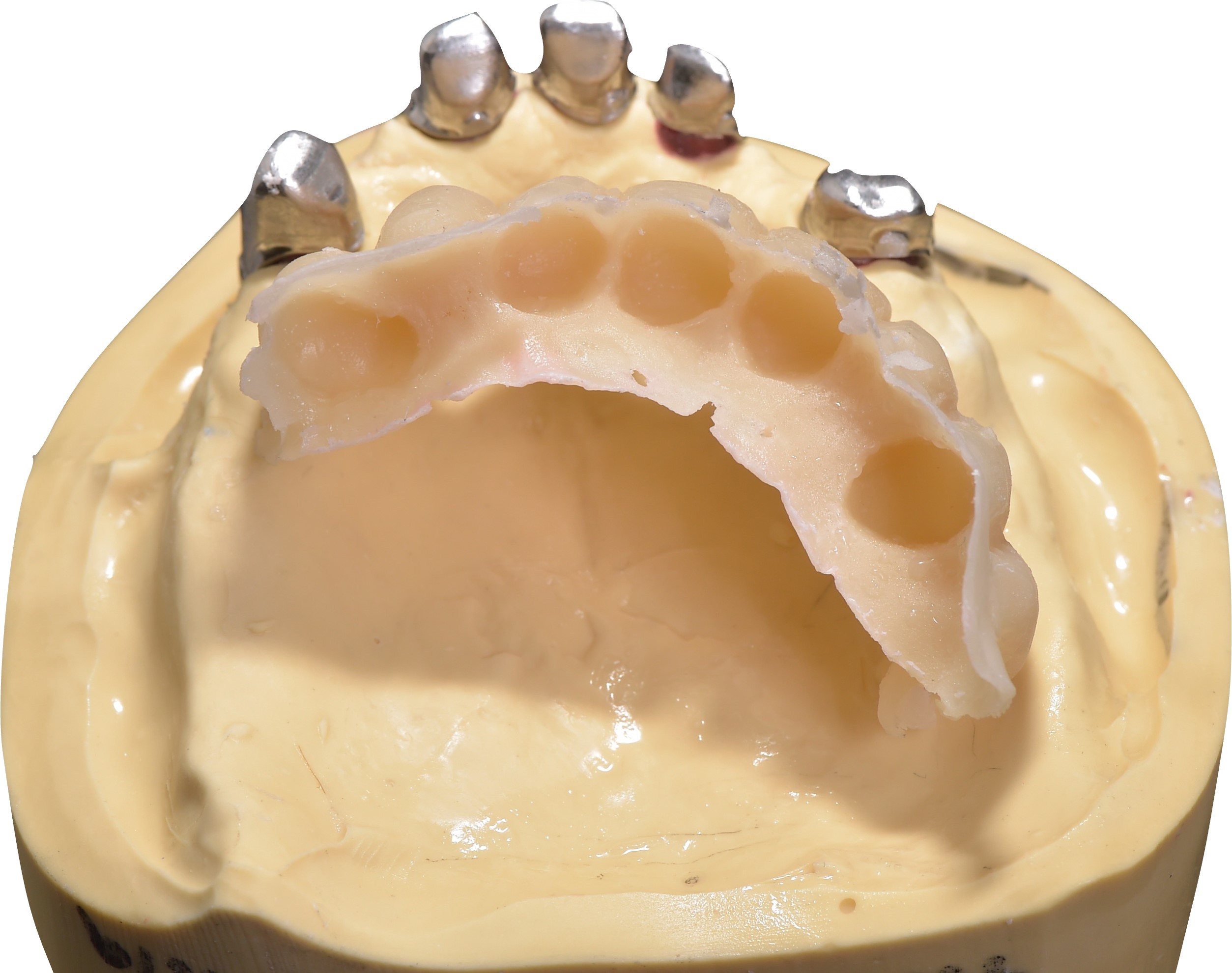 Außerdem ergibt sich noch ein weiterer, nicht zu unterschätzender Vorteil: Das Mock-up bzw. Set-up, welches zum ersten Anprobetermin passend auf den Innenteilen erstellt wurde, kann – ggf. nach ein wenig Umarbeitung – als Ersatz- bzw. Reiseprothese verwendet werden. Ob diese schon in die Kalkulation eingeflossen ist oder zusätzlich berechnet wird, kann jedes Labor für sich entscheiden.