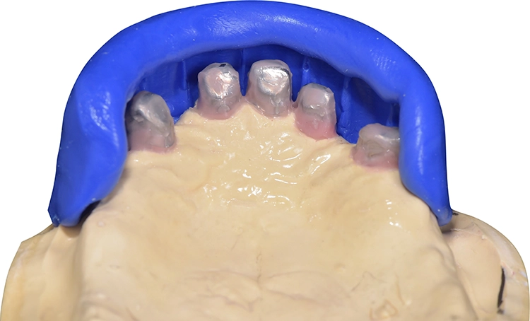 So vorbereitet kann in der Praxis mit der Präparation begonnen, mithilfe der Schlüssel kurz kontrolliert und im Anschluss abgeformt werden. Zu diesem Termin wird zahnärztlicherseits mit Knetsilikon eine Vorbissnahme durchgeführt, sodass das Labor Sägemodell und Gegenkiefer zur Herstellung der Innenteile einartikulieren kann. Die Erfahrung zeigt, dass diese einfachen Vorbissnahmen meist schon eine gute Genauigkeit aufweisen. Nun ist es möglich, für den nächsten Patiententermin eine ebenfalls schon recht exakte Bissschablone herzustellen, die auf den Innenteilen eindeutig fixiert ist. Das hat den großen Vorteil, dass an der Schablone zur Anpassung nicht mehr im Mund geschliffen werden muss und gleichzeitig der Sitz der Innenteile mit der Schablone im Mund kontrolliert werden kann.