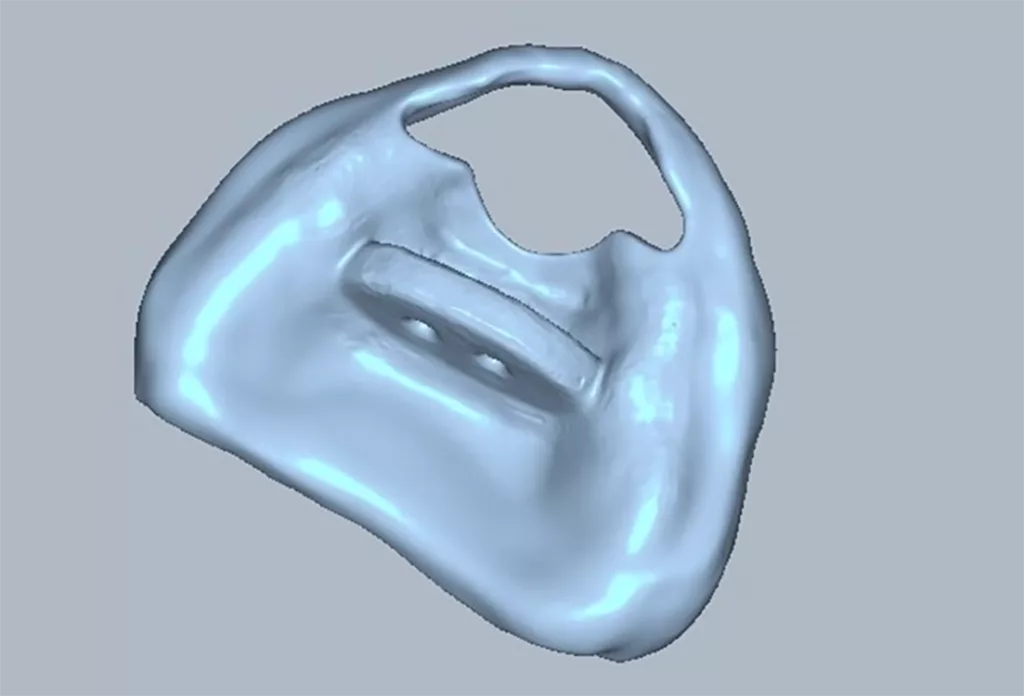 Ist die Abformung abgeschlossen, wird das Plattenwachs einschließlich der Abformmasse im Bereich der Fensterung mit einem Skalpell entfernt und die bearbeitete Abformung zurück auf den Kiefer gesetzt. Der gesamte Bereich des Schlotterkamms sollte durch das Fenster einsehbar sein. Der perfekte Sitz des Löffels ist wichtig, um einen Versatz und somit eine fehlerhafte optische Abformung zu vermeiden. Im Anschluss folgt der intraorale Scan des frei sichtbaren Kieferkamms samt den angrenzenden Teilen des Löffels.