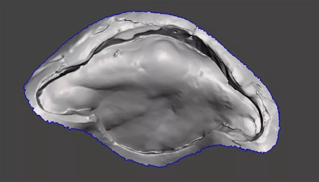 Das „Flippen“ funktioniert, indem man die gesamte Oberfläche des Scans anwählt und den Befehl „Edit ➝ Flip Normals“ ausführt. Im Anschluss wird der Scan des Gaumens so zurückgeschnitten, dass er mit dem Scan des Schlotterkamms verbunden werden kann. Dies erfolgt durch eine Brücke, die mit dem Befehl „Strg + B ➝ Bridge“ zwischen den beiden Gitternetzen gebaut wird. Das nun neu entstandene einzelne Gitternetz weist nur noch eine minimale Lücke auf.