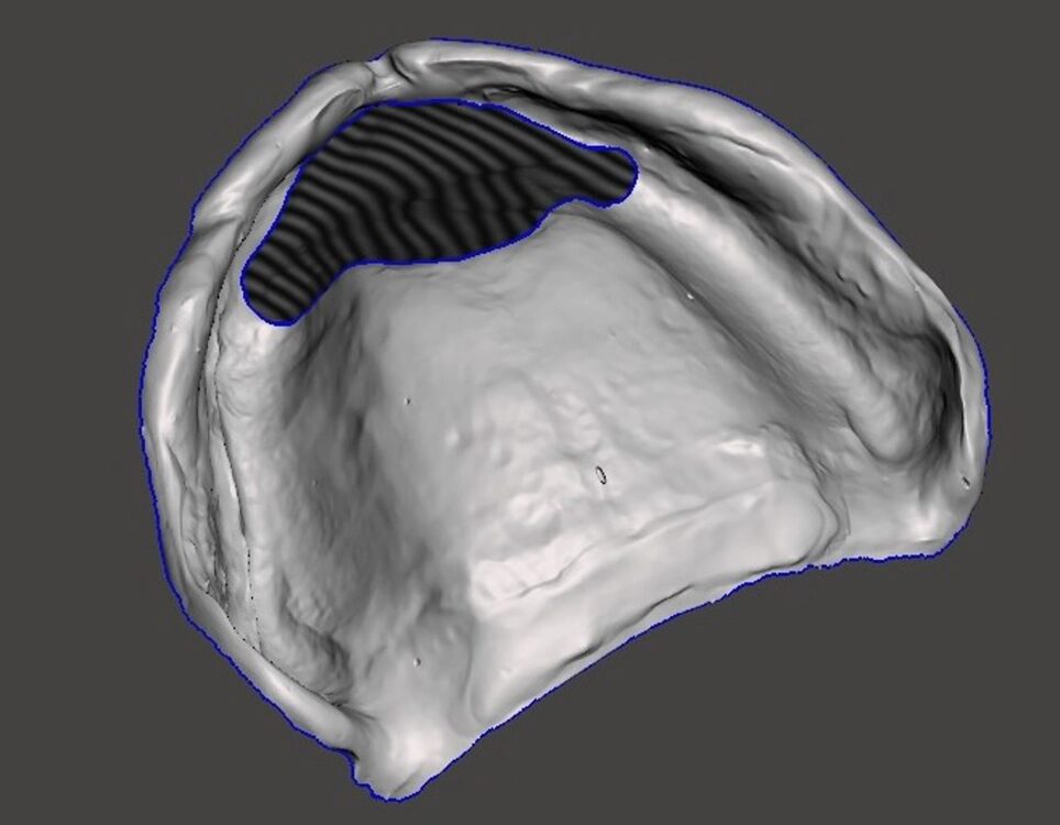 Schritt 3: Im Anschluss wird auch der 360°-Scan in zwei Teile zerlegt. Hier wird jedoch zuerst die Gaumenseite von der Löffeloberseite separiert; dies erfolgt, indem entlang der Umschlagfalte eine durchgehende Markierung gesetzt und wieder der Befehl „Y ➝ separate“ ausführt wird (Abb. 6). Die Löffeloberseite kann nun ebenfalls verworfen werden; übrig bleibt der gescannte Gaumen mit dem ausgesparten Bereich (Abb. 7 und 8).