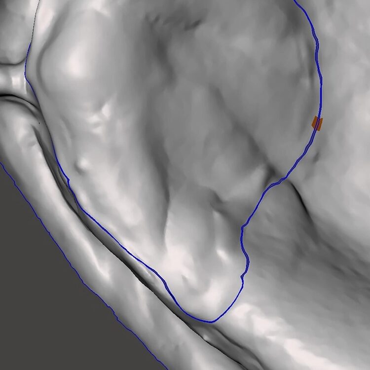 Es bildet einen nahezu kompletten Kreis bis auf die Stelle, wo die Brücke gebaut wurde (Abb. 10). Diese wird nun durch den Befehl „F ➝ Fill“ geschlossen. Die Größe des Spalts zwischen dem beschnittenen Teilscan und dem bearbeiteten 360°-Scan bestimmt das Maß der Ungenauigkeit, die bei der Verbindung beider Scans entsteht; dieser eher kleine Bereich ist dabei nie detailgetreu. Auf der so entstandenen digitalen Grundlage – quasi einem digitalen Meistermodell – wird der Schlotterkamm ideal abgeformt dargestellt, was die Herstellung einer bestmöglich passenden Restauration erlaubt (Abb. 11).
