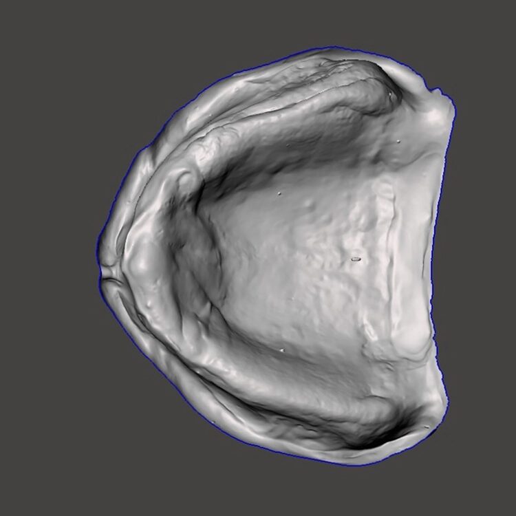Schritt 3: Im Anschluss wird auch der 360°-Scan in zwei Teile zerlegt. Hier wird jedoch zuerst die Gaumenseite von der Löffeloberseite separiert; dies erfolgt, indem entlang der Umschlagfalte eine durchgehende Markierung gesetzt und wieder der Befehl „Y ➝ separate“ ausführt wird (Abb. 6). Die Löffeloberseite kann nun ebenfalls verworfen werden; übrig bleibt der gescannte Gaumen mit dem ausgesparten Bereich (Abb. 7 und 8).