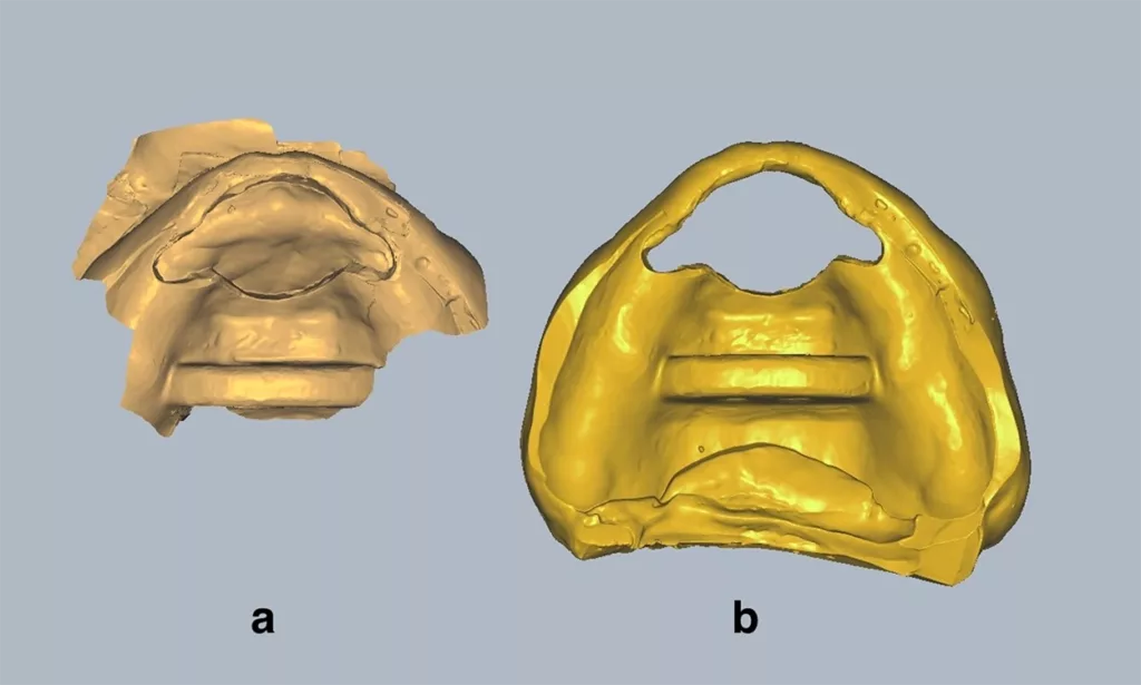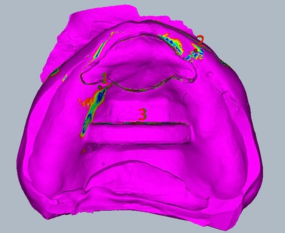 Verwendet man beispielsweise einen mit Perforationen versehenen Abformlöffel, kann hier die überschüssige Abformmasse abfließen, was den Druck auf den Schlotterkamm reduziert [6, 7, 8]. Eine andere Möglichkeit besteht darin, den Bereich des Schlotterkamms sachte mit Abformgips zu bestreichen und anschließend aushärten zu lassen, um eine bestmögliche Stabilisierung des Schlotterkamms bei der nachfolgenden Funktionsabformung zu erreichen [9]. Beide Techniken haben Nachteile im Handling und auch im mutmaßlichen Behandlungserfolg; eine rein digitale Abformung ist wiederum aus den oben beschriebenen Gründen nicht zielführend [10, 11, 12].