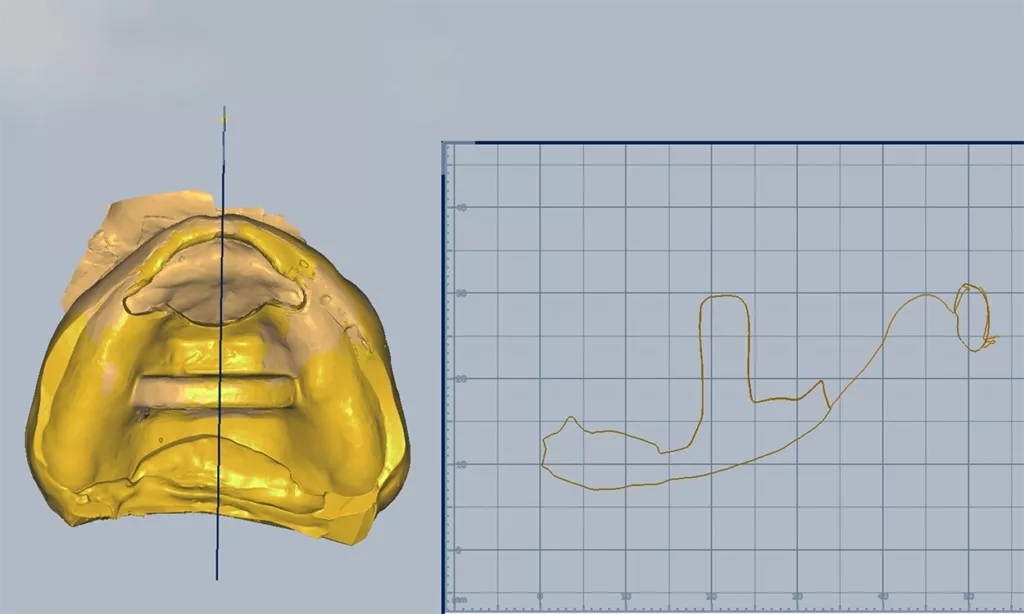 Ist die Abformung abgeschlossen, wird das Plattenwachs einschließlich der Abformmasse im Bereich der Fensterung mit einem Skalpell entfernt und die bearbeitete Abformung zurück auf den Kiefer gesetzt. Der gesamte Bereich des Schlotterkamms sollte durch das Fenster einsehbar sein. Der perfekte Sitz des Löffels ist wichtig, um einen Versatz und somit eine fehlerhafte optische Abformung zu vermeiden. Im Anschluss folgt der intraorale Scan des frei sichtbaren Kieferkamms samt den angrenzenden Teilen des Löffels.