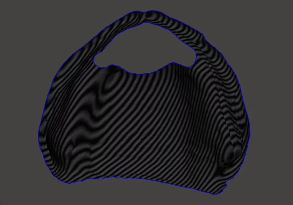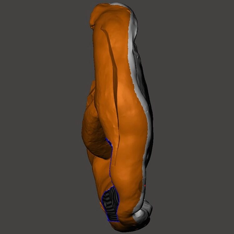 Das „Flippen“ funktioniert, indem man die gesamte Oberfläche des Scans anwählt und den Befehl „Edit ➝ Flip Normals“ ausführt. Im Anschluss wird der Scan des Gaumens so zurückgeschnitten, dass er mit dem Scan des Schlotterkamms verbunden werden kann. Dies erfolgt durch eine Brücke, die mit dem Befehl „Strg + B ➝ Bridge“ zwischen den beiden Gitternetzen gebaut wird. Das nun neu entstandene einzelne Gitternetz weist nur noch eine minimale Lücke auf.