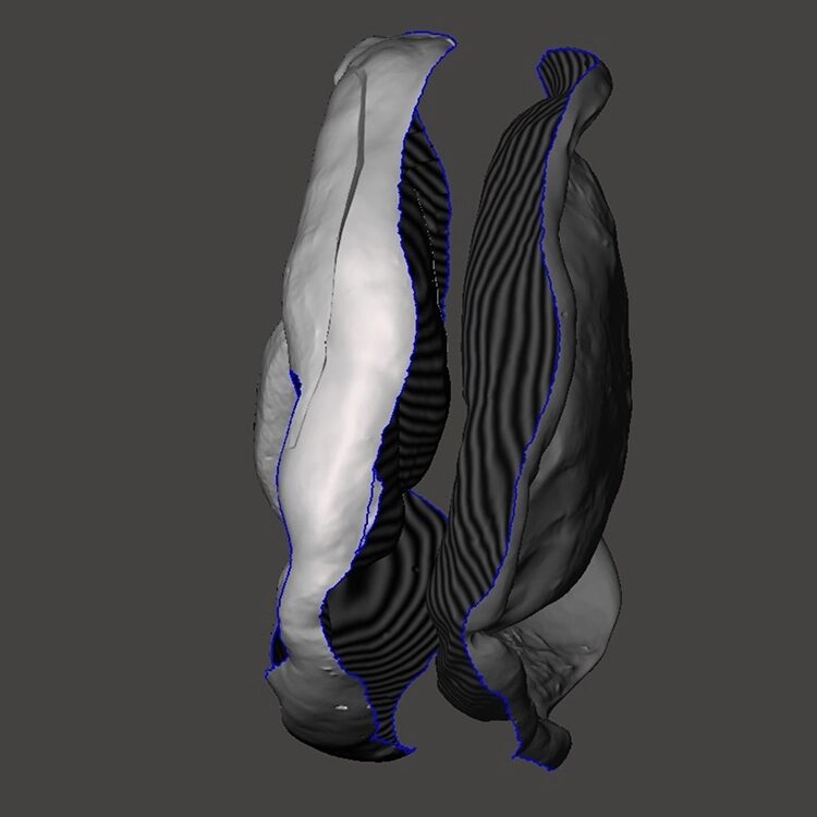 Schritt 4: Für die spätere Verarbeitung ist es wichtig, dass der angepasste 360°-Scan und der angepasste Scan des Schlotterkamms wieder die gleiche Ausrichtung haben (Abb. 9). Einer der beiden Scans muss nun „geflipped“ werden (Umkehrung der Oberflächenbezeichnung), um eine gleiche Ausrichtung zu erzielen.