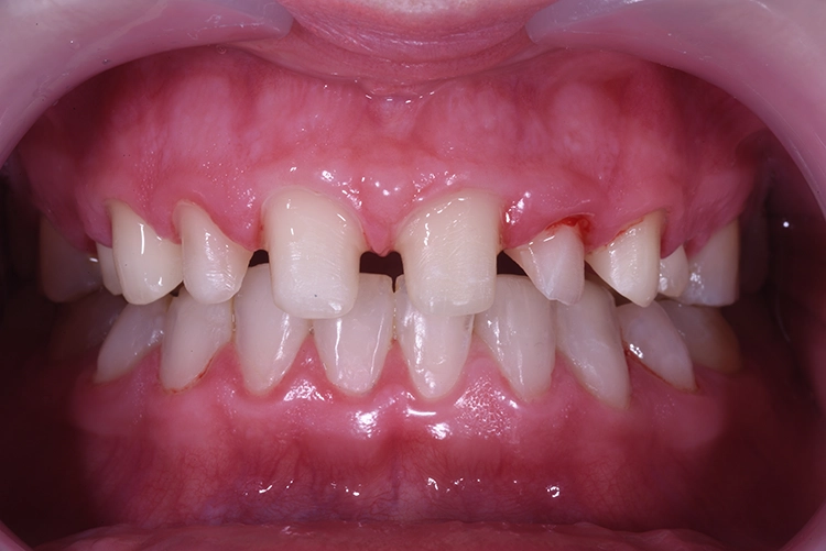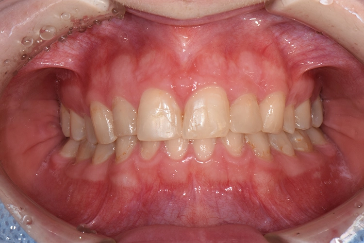 Bei der Ausarbeitung einer Behandlungsstrategie für die Patientin spielten mehrere Faktoren eine Rolle. An erster Stelle stand die Sorge hinsichtlich der starken Abnutzung durch Bruxismus, die offensichtliche Erosion und die erhöhte Kariesanfälligkeit. Außerdem hatte die Patientin eine eckige Zahnform, die nicht zu ihrem runden Gesichtsprofil passte. Vor einer umfassenden prothetischen Behandlung wurde ein kieferorthopädischer Behandlungsplan mit transparentem Aligner erstellt.