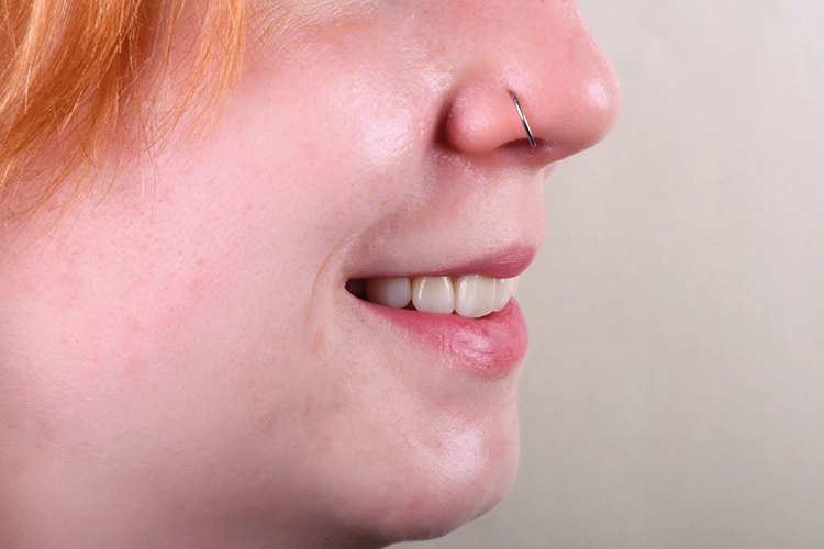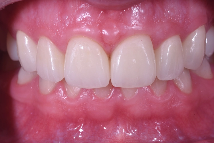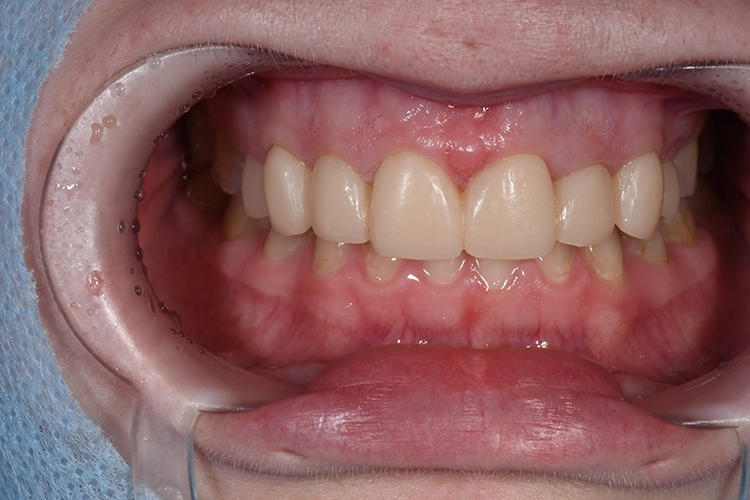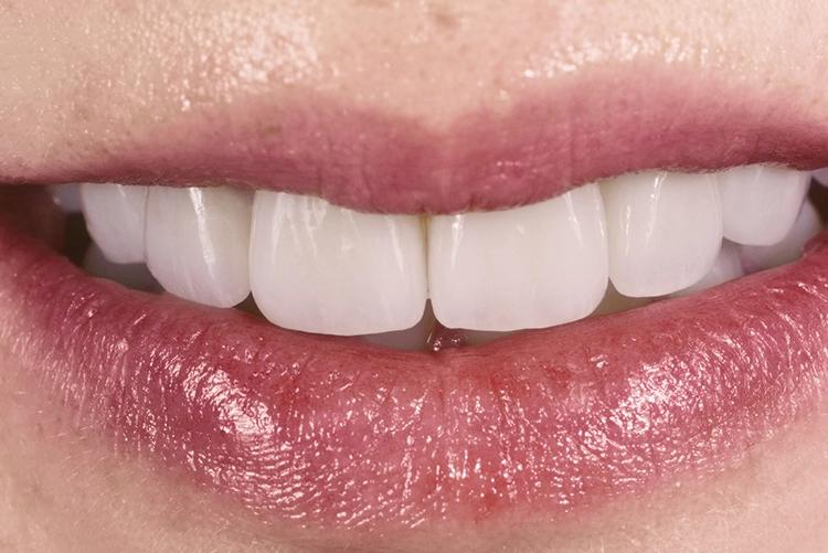 Das Ergebnis sah natürlich aus und entsprach der Individualität und Gesichtsmorphologie der Patientin. Trotz der Verwendung unterschiedlicher Materialien für Schneide-, Eckzähne und Prämolaren gehen diese optisch nahtlos ineinander über und lassen keine Inkonsistenzen erkennen. Die mit Labialverblendung versehenen und die unbehandelten Bereiche fügen sich harmonisch ineinander, was zu einem kohärenten ästhetischen Ergebnis ohne sichtbare Abweichungen führt.