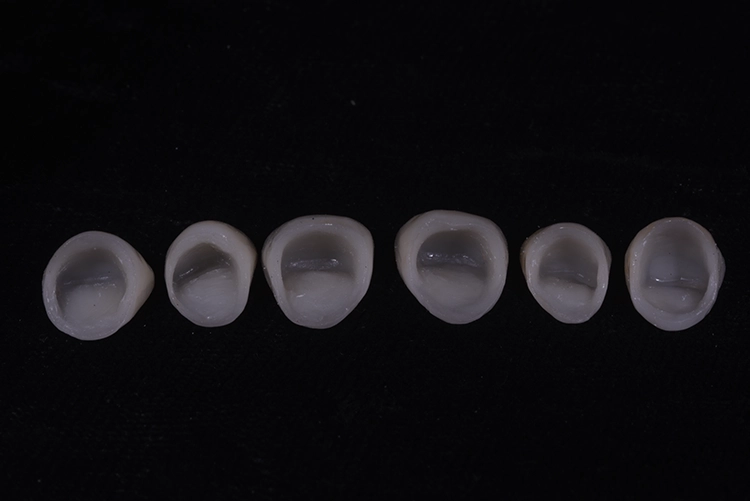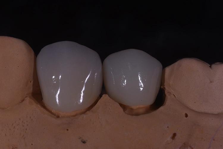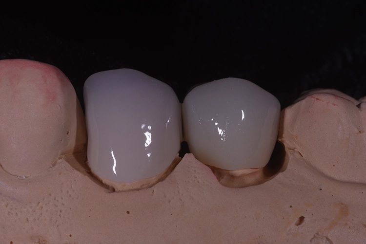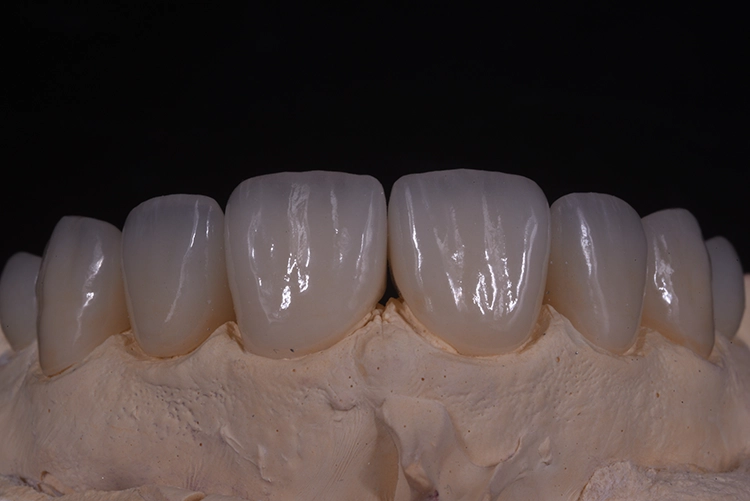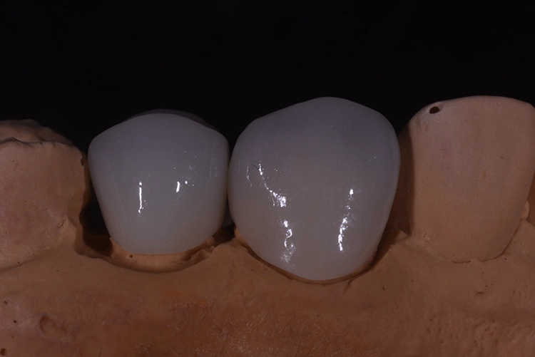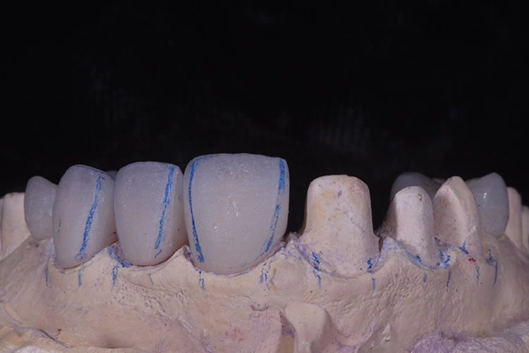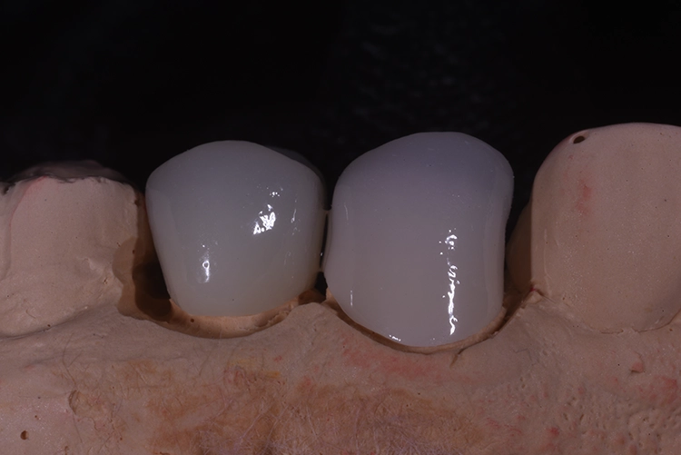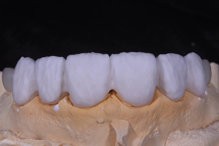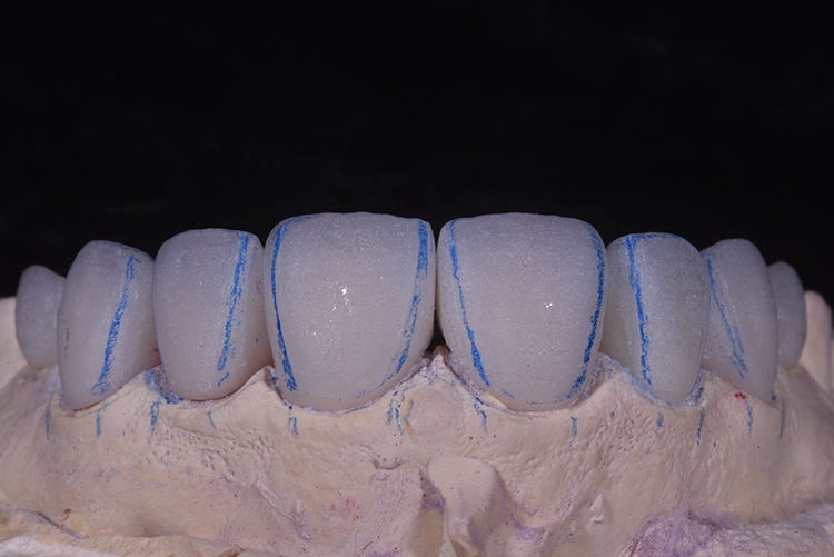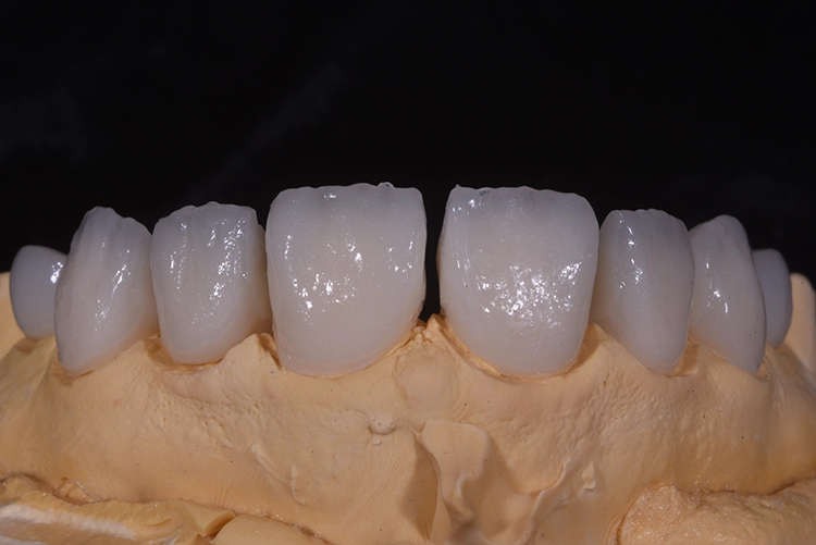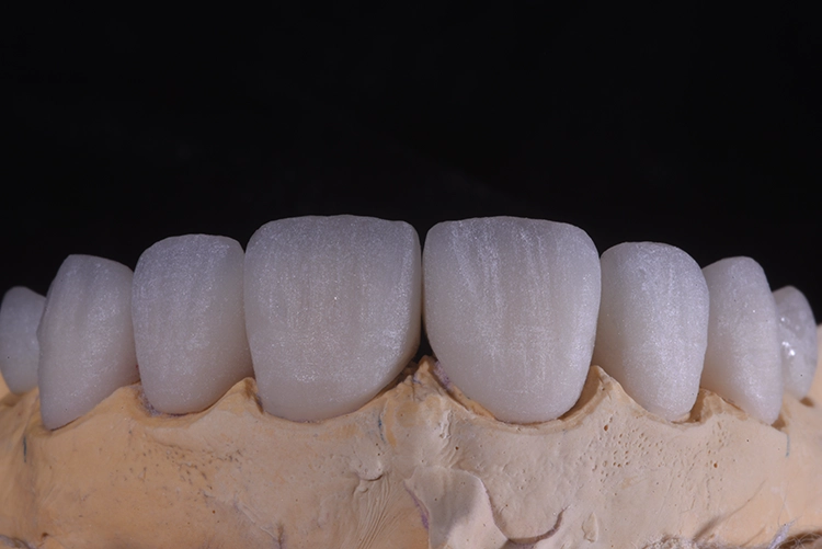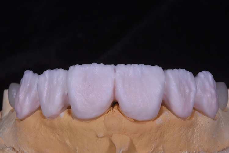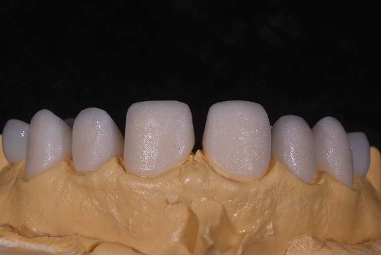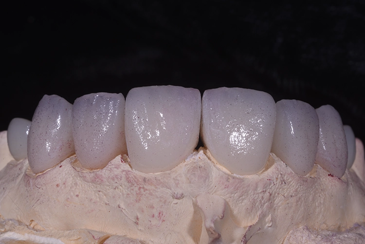 Für die Zähne 12–22 wurden gepresste Lithiumdisilikat-Kronen aus MT-Rohlingen (Medium Translucency) in der Farbe A1 hergestellt. Die Kronen für die Eckzähne wurden aus Zirkoniumdioxid MT (Farbe A2) gefertigt. Nach einem Washbrand bei allen Kronen wurden im Anschluss die zervikalen Bereiche mit Standard-Dentin A1 und die inzisalen Bereiche mit einer 1:1-Mischung aus Dentin und neutralem Pulver aufgebaut. Danach wurden die aufgebauten Kronen selektiv beschliffen, um eine natürlichere Mamelonform zu schaffen.