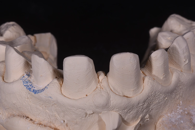 - Um ein symmetrisches Gingivaprofil zu erhalten, wurde der faziale freie Gingivarand von Zahn 22 auf dem Modell so angepasst, dass der faziale gingivale Scheitelpunkt mit dem von Zahn 12 übereinstimmte.
